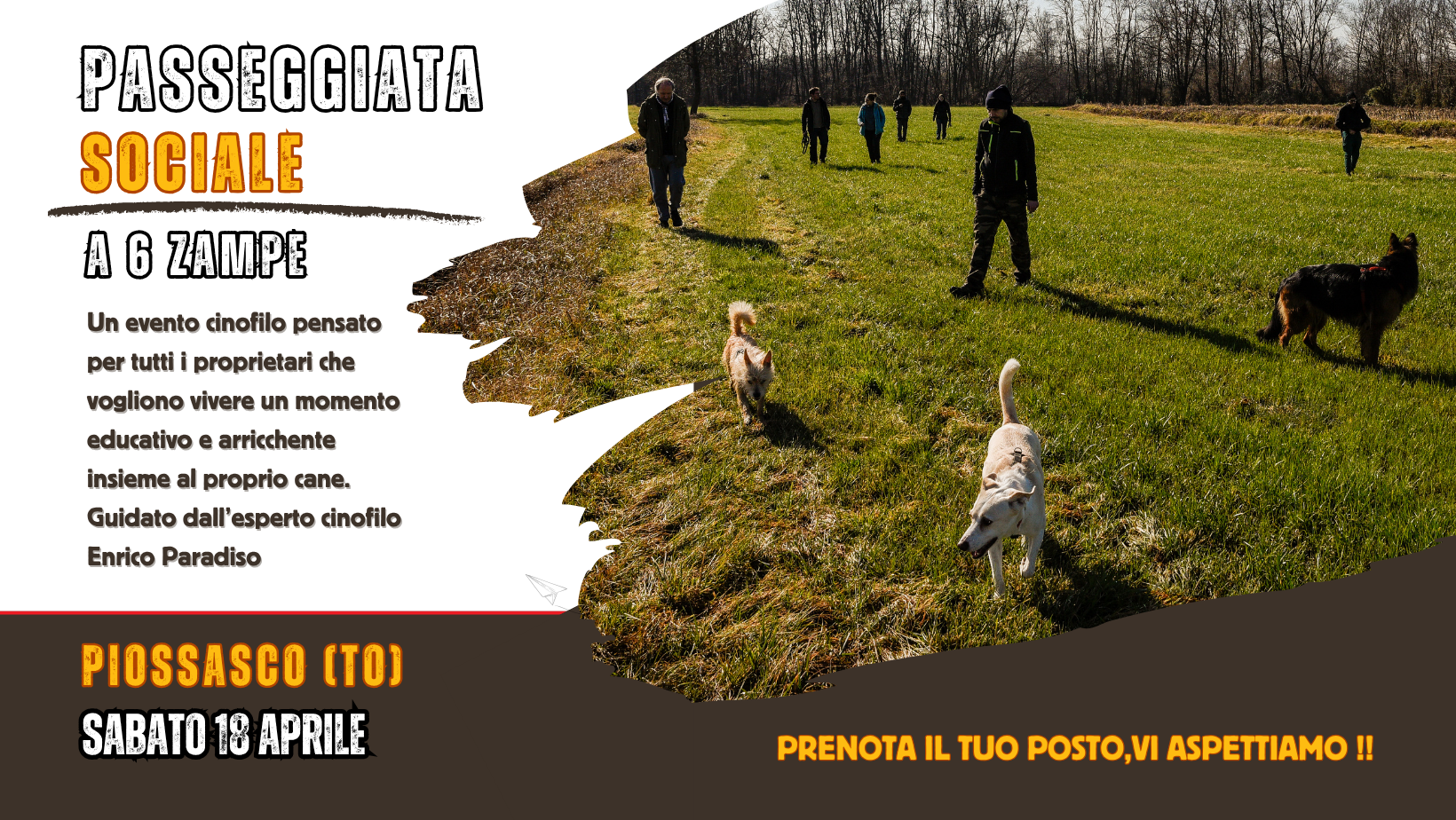 Sabato 18 Aprile non perdere la Passeggiata Sociale a 6 Zampe a Piossasco (TO), un evento cinofilo pensato per tutti i proprietari che vogliono vivere un momento educativo e divertente insieme al proprio cane. Guidato dall’esperto cinofilo Enrico Paradiso, l’evento è un’occasione preziosa per migliorare la relazione con il tuo cane e favorire la socializzazione in un contesto sereno e controllato.