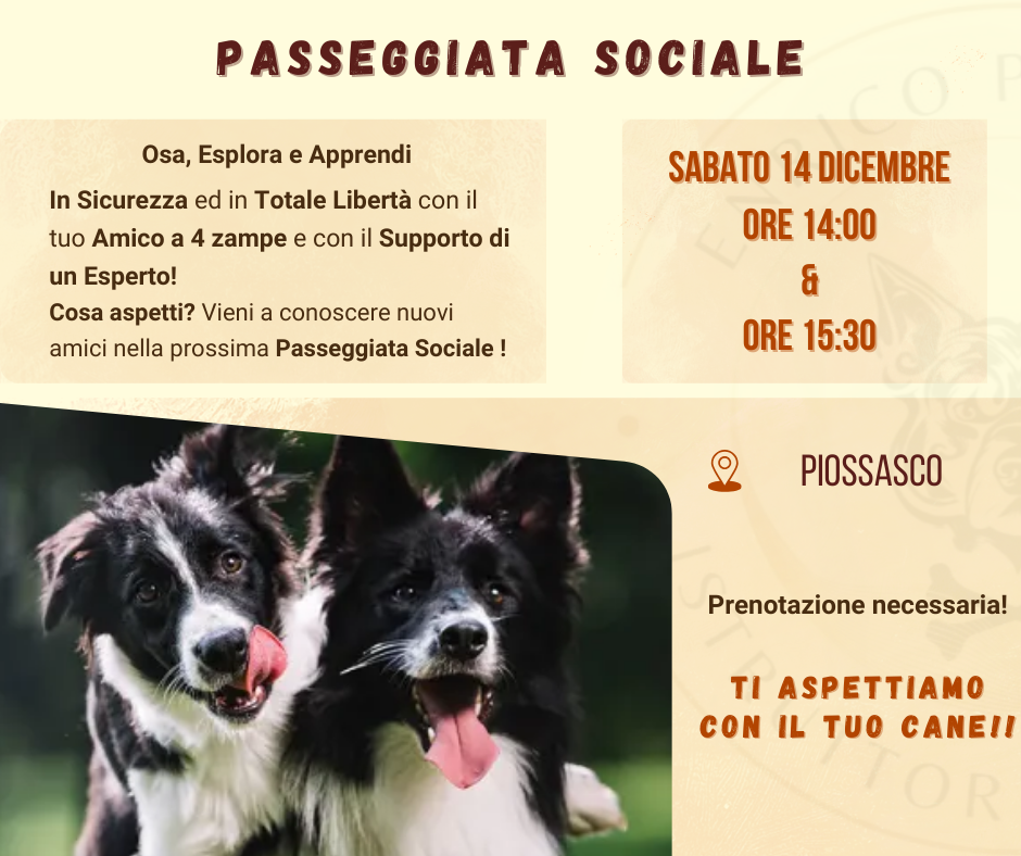 Sabato 14 Dicembre a Piossasco (TO) ritorna la Passeggiata Sociale con i cani! Unisciti a noi in questo innovativo evento per aiutare il tuo cane a socializzare in piacevole compagnia di altri proprietari e in totale sicurezza, contando costantemente sui consigli e sul supporto dell’esperto.